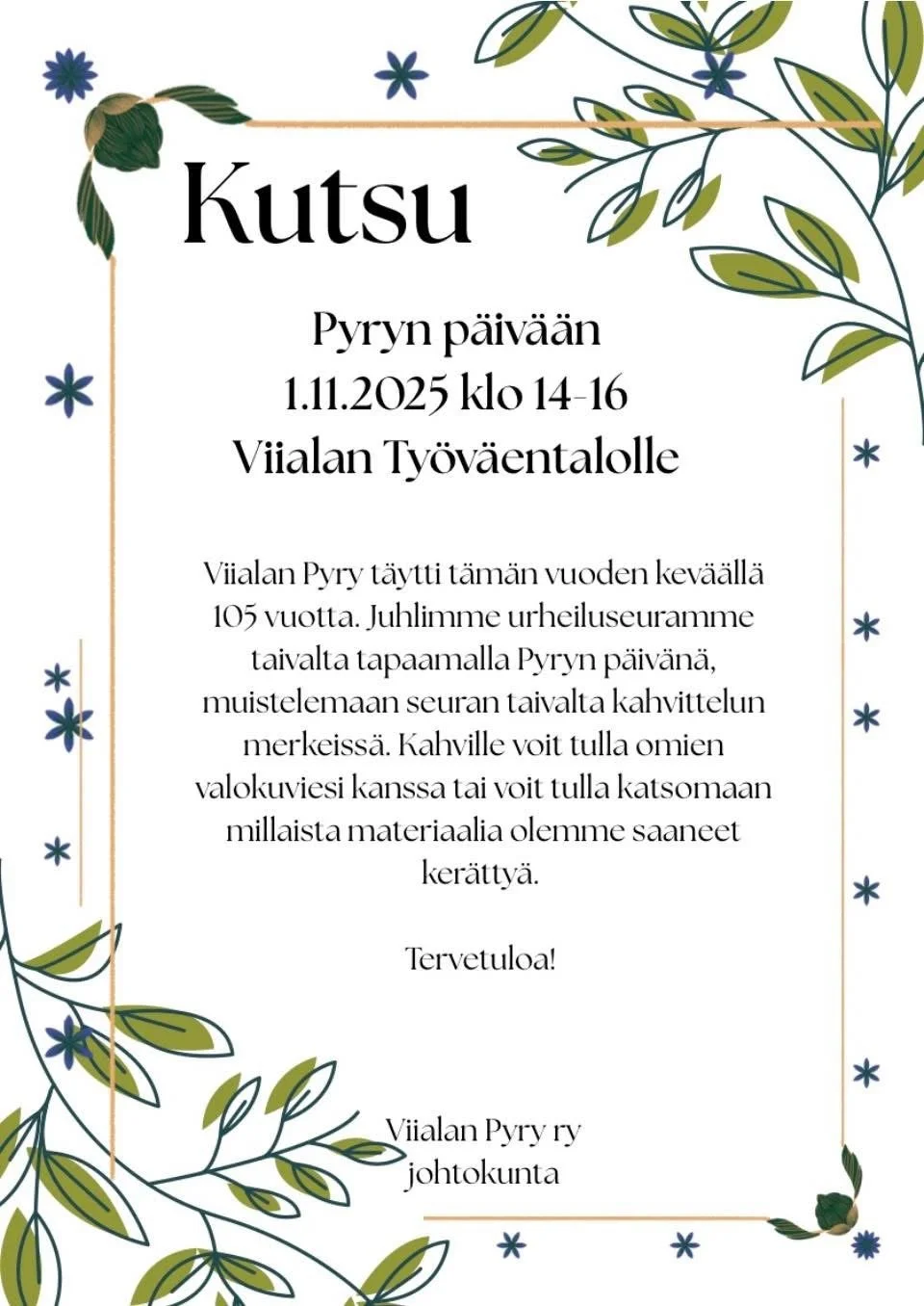 Viialan Pyryn sääntömääräinen syyskokous su 23.11.2025 klo 18 Viialan Työväentalolla. Tervetuloa!